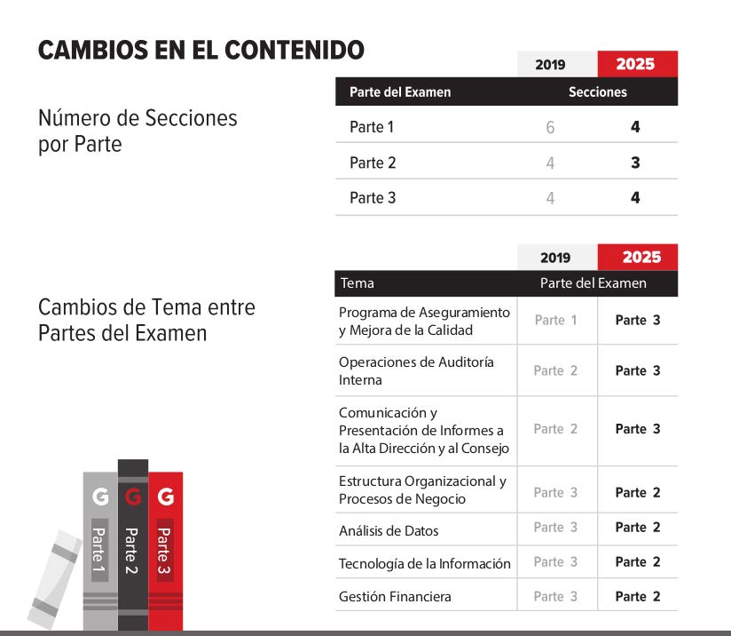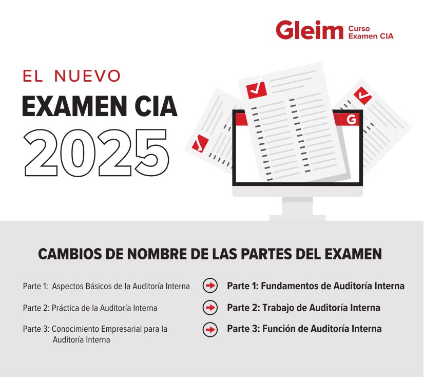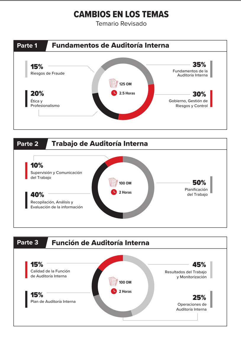 El nuevo examen continuará cubriendo los temas de Fundamentos de Auditoría Interna y Riesgos de Fraude, y ambos tendrán un mayor énfasis. La sección de Gobierno, Gestión de Riesgos y Control tendrá un énfasis ligeramente menor en el nuevo examen. En la Parte 1 también se introducirá un nuevo tema titulado Ética y profesionalismo.